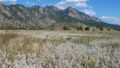 After crossing a small irrigation channel, the trail opens into a wide prairie where you can see views of the Flatirons mountains.